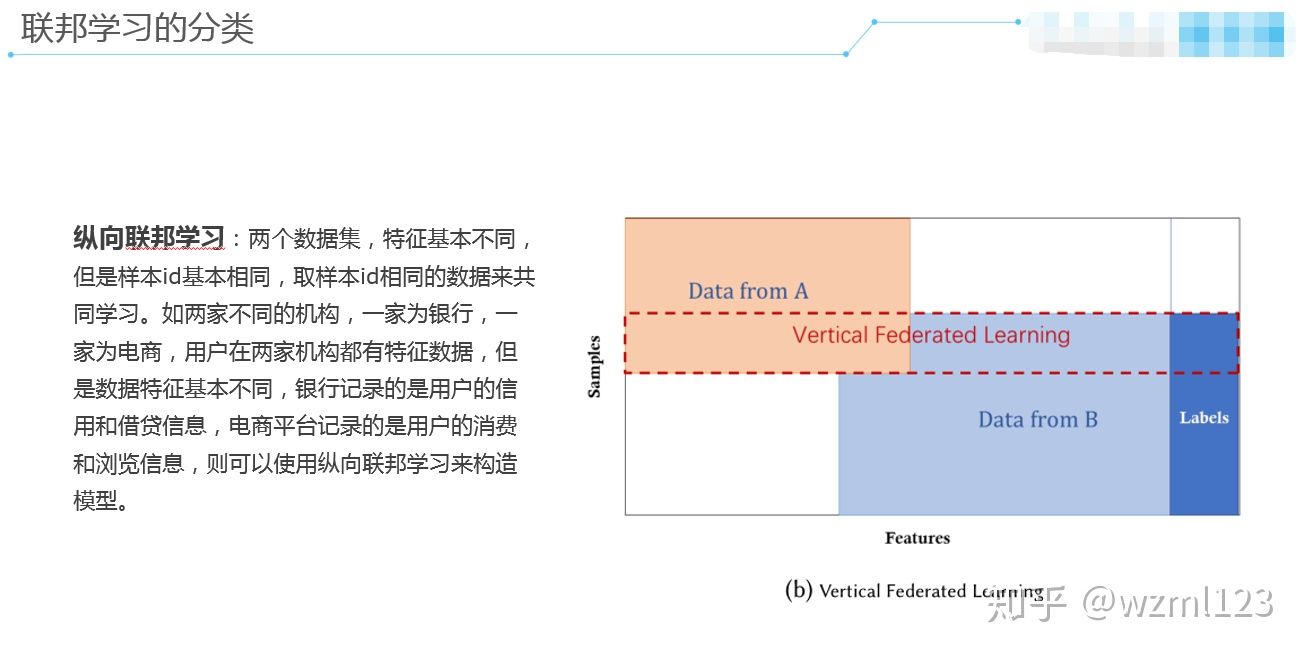 针对纵向划分的数据,提出了保护隐私的机器学习算法,包括合作统计分析,关联规则挖掘,安全线性回归,分类和梯度下降。纵向联邦学习或基于特征的联邦学习适用于两个数据集共享相同的样本ID空间但特征空间不同的情况。
