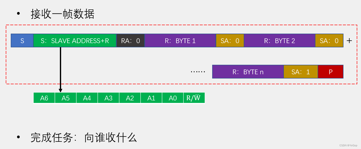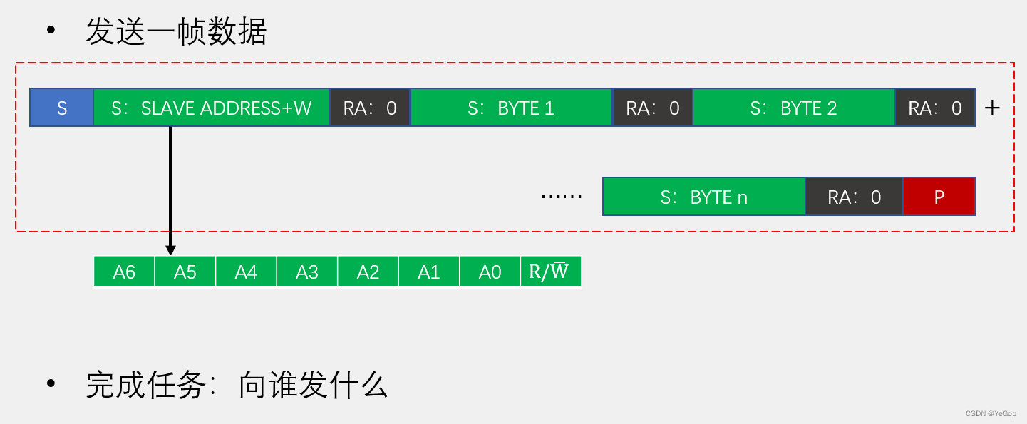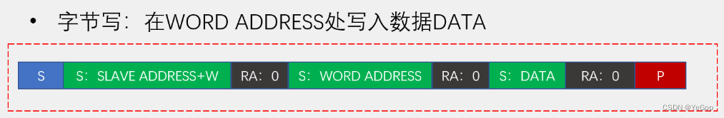 这里我们发现,在S(即开始)之后,有一个SLAVE ADRESS+R/W的一个字节,这个字节就是我们前面说过的匹配对象的过程同时也确定了主机为接收端还是发送端。