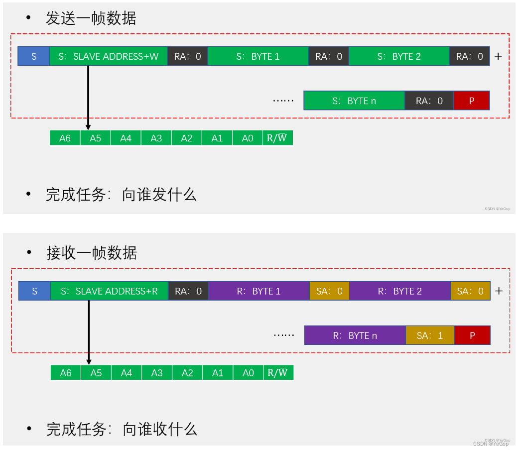 首先,I2C使用的是半双工的模式,那么,既然是半双工,半双工相互联通的两个设备之间是可以进行相互连接并相互通信的,现在我们假设有两个设备,分别为A和B,那么我们现在假设我们的主体是A,即我们把A设备当作主机,A设备作为第一人称,对于A设备来说,我们是有接收数据和发送数据两种状态的,下面我们就来解释一下接收和发送数据两种方式的具体操作,当然,下面的所有操作都是默认已经执行了通过地址链接了两部设备,即基于已经完成了对象匹配的过程。