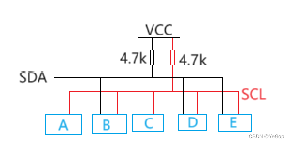 它使用两根通信线:SCL(Serial Clock)、SDA(Serial Data)