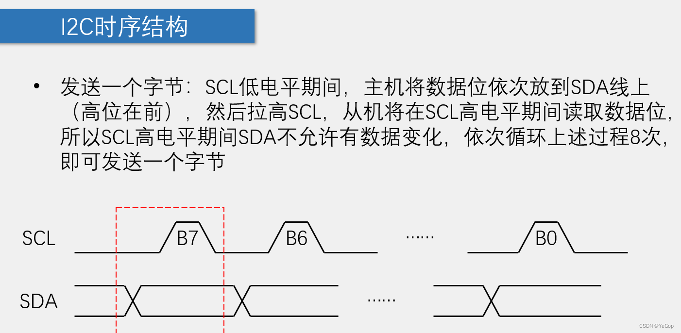 所以,只要我们需要读取数据,在SCL为高电平的时候,SDA不能改变,只能为高电平表示1,低电平表示0,SCL为低电平的时候,SDA再调整高低电平,为下一个数据做准备。