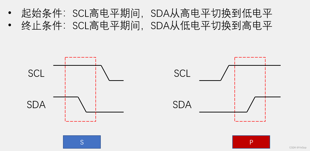 I2C的时序是有规律的,首先要讲的就是收发数据起始条件和终止条件: