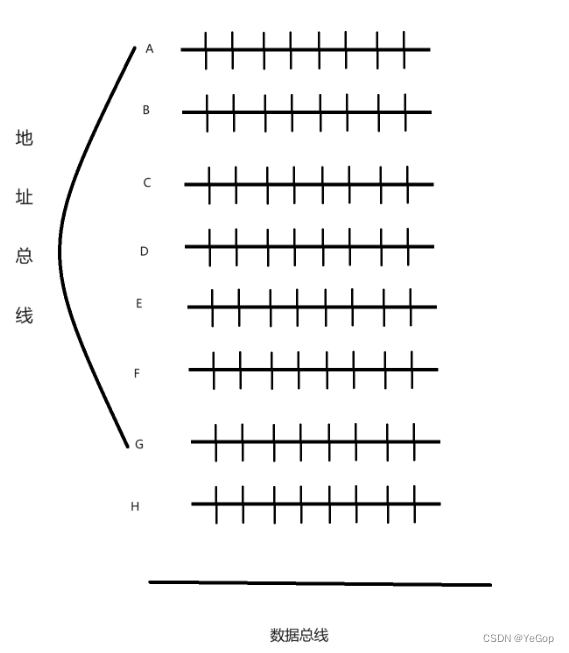地址总线较为复杂,我们可以简化成上面的原理图进行说明:首先,地址总线上对应的是不同的设备,一般前面还会加一个译码器,通过对应的地址找到需要选中的设备,并且只能选中一行,这样就可以实现每次只有一个设备写入读取数据,就不会搞混了。选中设备后,设别就把数据写入到数据总线中去了。