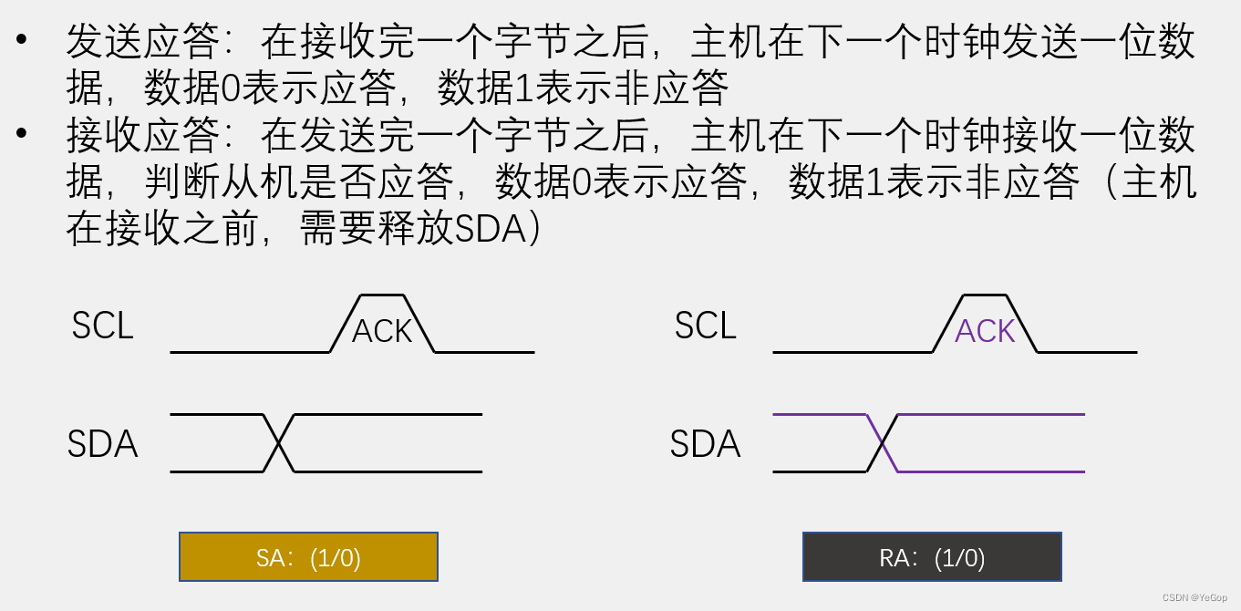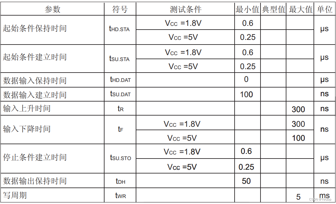 SCL为时钟线,在SCL为高电平期间读取SDA上的数据,SDA在执行开始和结束读写命令的时候才可以在SCL为高电平期间变化,否则只能在SCL为高电平期间为高电平或者低电平两种状态,分别表示数据1和0。