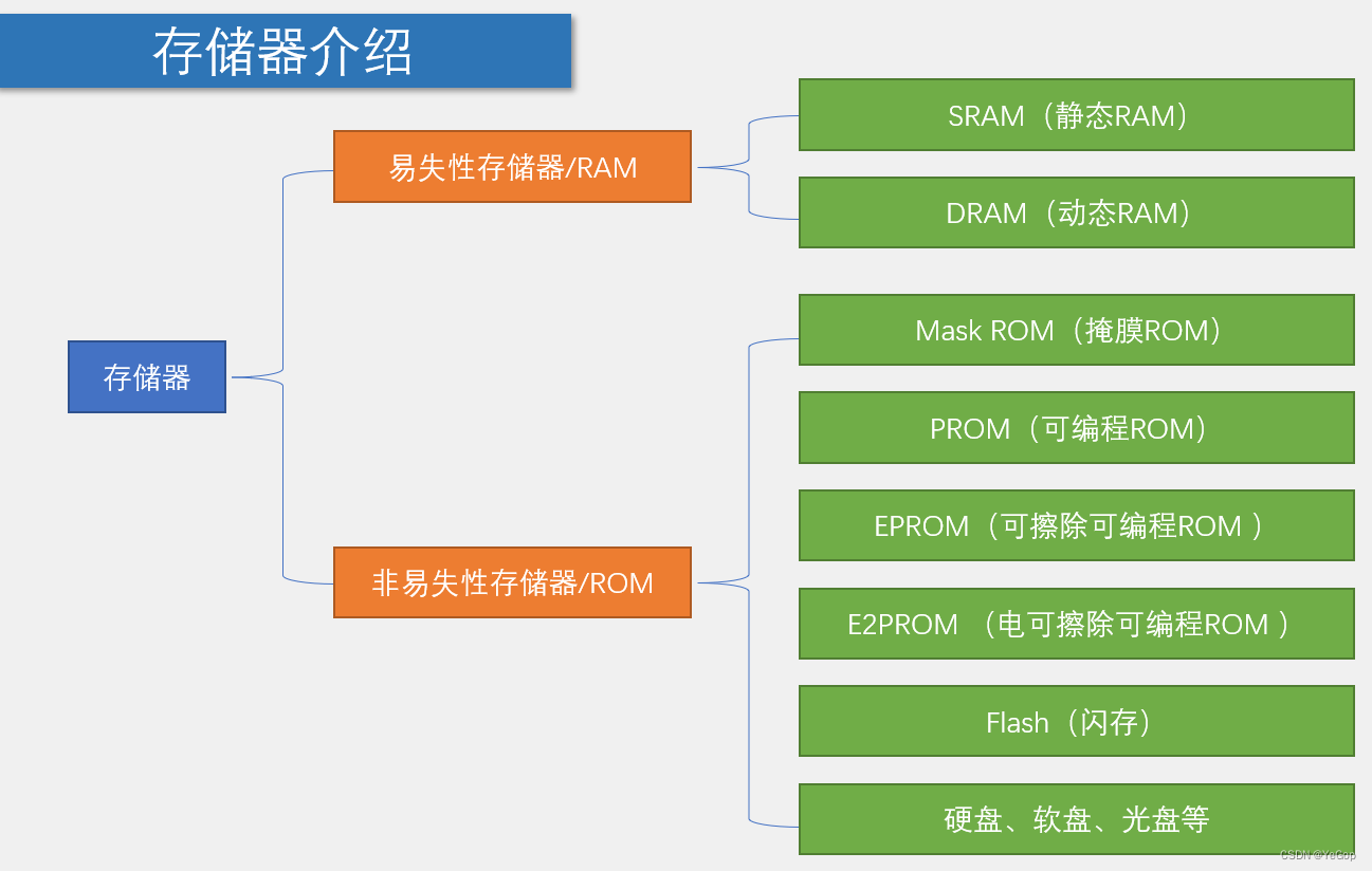 ROM分为很多种,有:Mask ROM(掩膜ROM),PROM(可编程ROM),EPROM(可擦除编程ROM),E2PROM(电可擦除可编程ROM),Flash(闪存),以及硬盘,软盘,光盘等