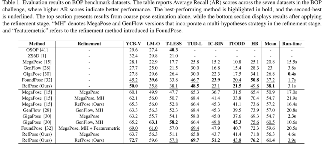 整体性能表现RefPose 在 BOP(Benchmark for 6D Object Pose Estimation)基准测试的七个主流数据集上表现出色,包括 YCB-V、LM-O、T-LESS、TUDL、ICBIN、ITODD 和 HB。