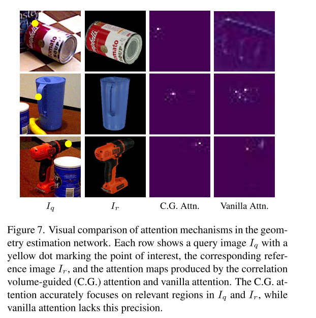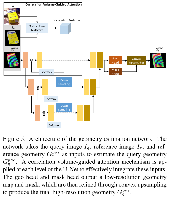 几何估计辅助(Geometry Estimation with Correlation-Guided Attention)在得到初始粗略姿态后,利用相关体积引导的注意力机制对查询图像的几何信息进行估计。这里通过引入“相关体积”(correlation volume)引导模型聚焦于查询图像和模板之间的相关区域,从而提高几何估计的准确性。