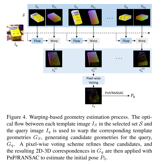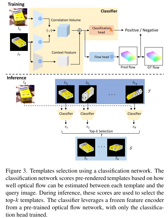 提出基于光流的分类器以改进模板选择,并引入基于变形的几何估计方法,结合中位数投票增强对异常值的鲁棒性,实现更准确的粗略位姿估计。推荐课程:机械臂6D位姿估计抓取从入门到精通。
