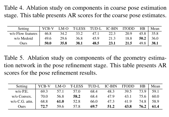 RefPose 的粗略姿态估计即使和 MegaPose 细化阶段结合,也优于 MegaPose 自身的粗略估计。