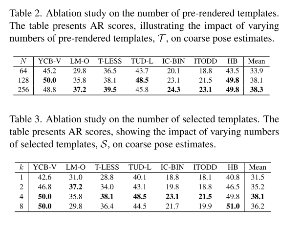 预渲染模板数量、选用模板数量、粗略姿态估计各个模块和细化阶段关键组件均经过系统消融验证,证明了各部分设计对性能提升的有效性和必要性。