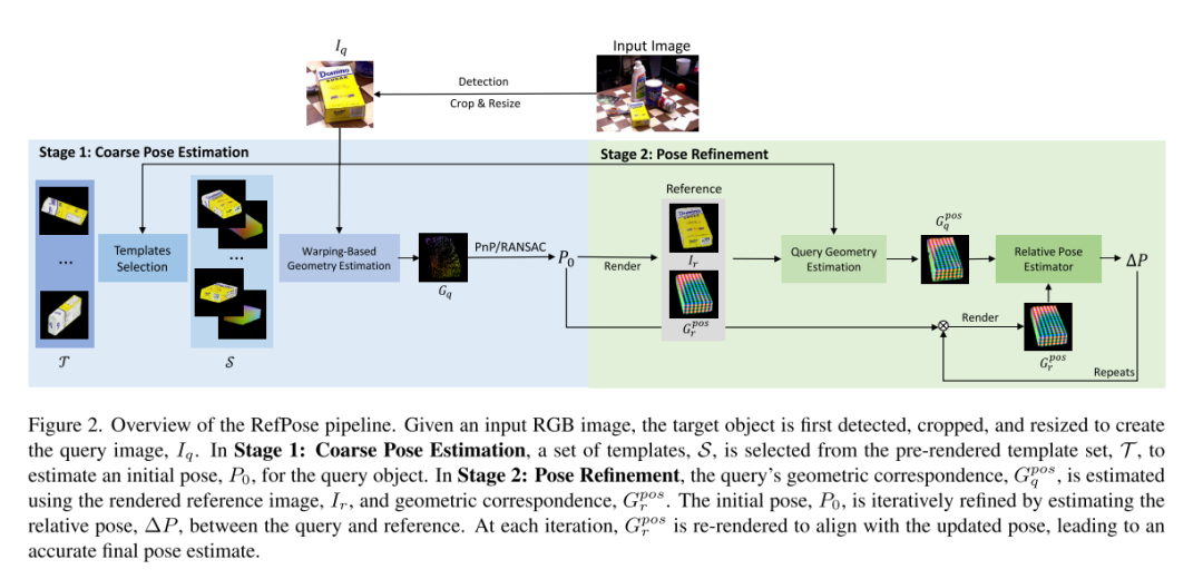 本文提出了 RefPose,一种旨在提升未知物体姿态估计精度和泛化能力的两阶段方法。首先通过模板选择和基于中位数投票的粗略姿态估计,构建初始姿态;随后利用相关体积引导的注意力机制辅助几何估计。该几何估计结果用于支持迭代的渲染-比较过程,从而得到精确的最终姿态。大量在 BOP 基准上的实验验证了 RefPose 的优异性能和良好泛化能力,消融研究也证实了各组件的有效性。RefPose 推动了适用于复杂真实场景的 6D 姿态估计的高效且可适应的解决方案的发展。