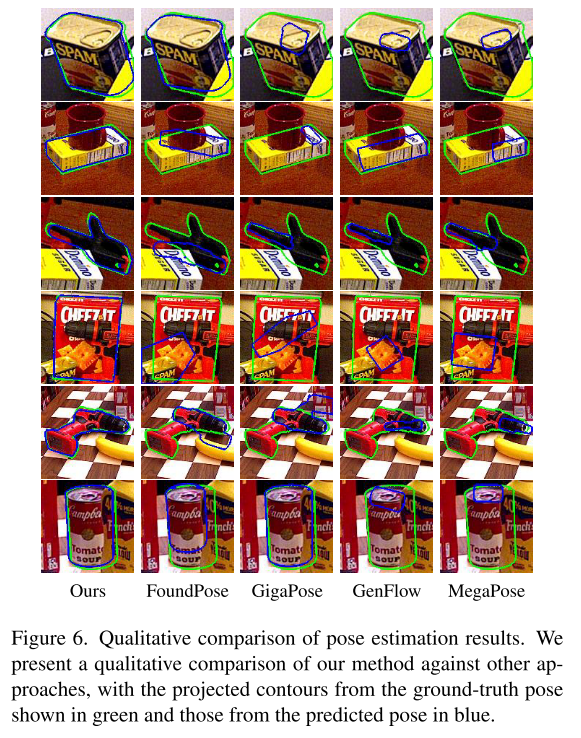 姿态估计结果的定性比较。我们将我们的方法与其他方法进行了定性比较,其中绿色为真实值姿态的投影轮廓,蓝色为预测姿态的投影轮廓。