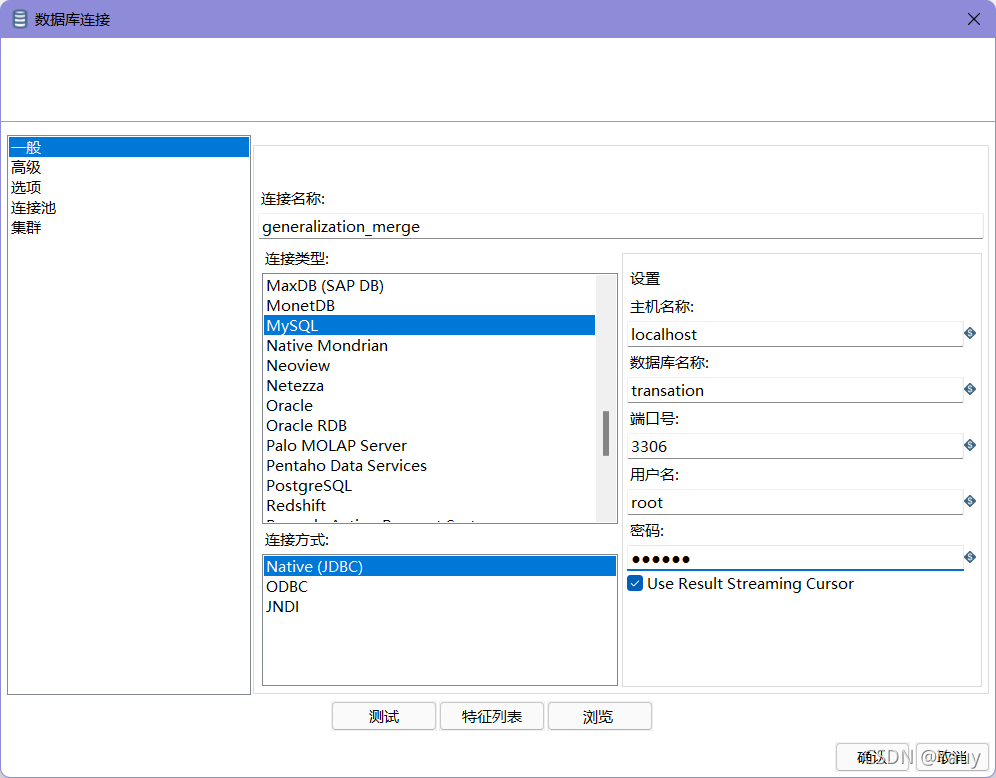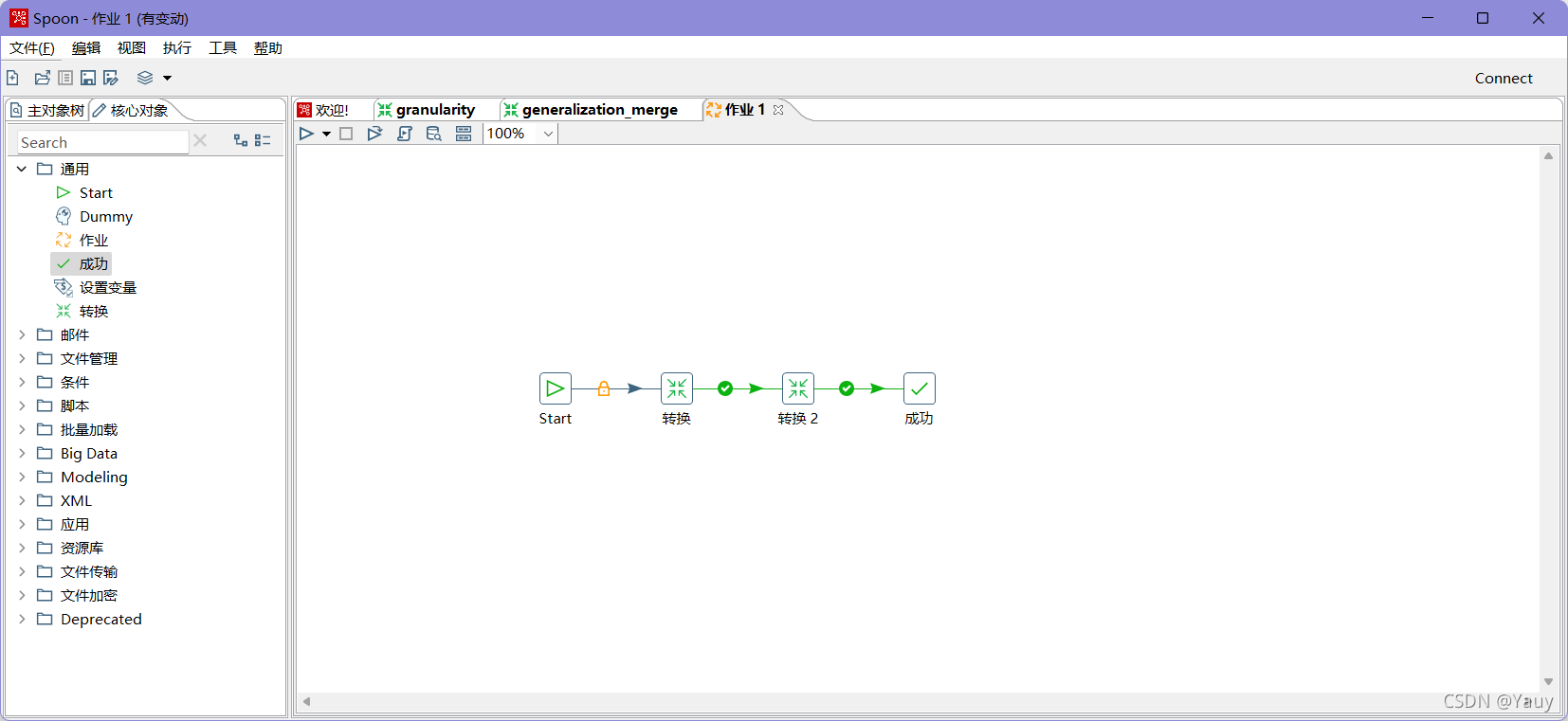 新建作业,使用Kettle工具,创建一个作业generalization,并添加“Start”、“转换”、“成功”控件