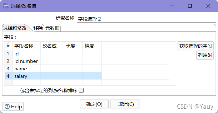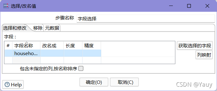 双击“字段选择”控件,进入“选择/改名值”界面,在“选择和修改”选项卡处添加字段名称