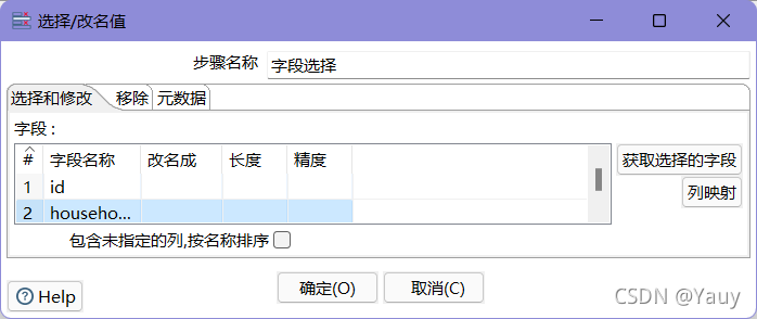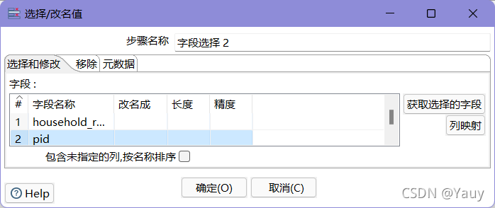 双击“字段选择2”控件,进入“选择/改名值”界面,在“选择和修改”选项卡处添加字段名称,这里添加的是记录集连接流中的字段household_register和pid