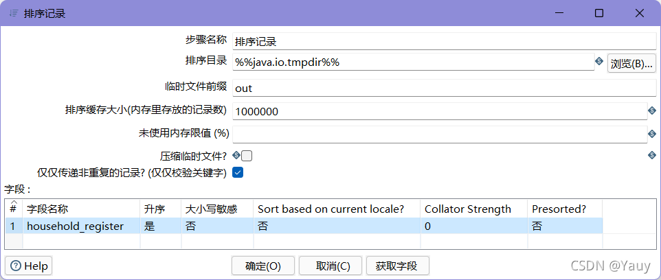 双击“排序记录”控件,进入“排序记录”界面,并在“字段”框中添加字段household_register,对其进行排序