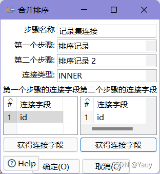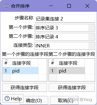 双击“记录集连接”控件,进入“合并排序”界面,在“第一个步骤”处的下拉框中选择“排序记录”,“第二个步骤”处的下拉框中选择“排序记录2”;在“第一个步骤的连接字段”和“第二个步骤的连接字段”处添加连接字段,这里添加的连接字段是id;在“连接类型”处的下拉框选择连接类型,这里选择的LEFT OUTER,即左外连接