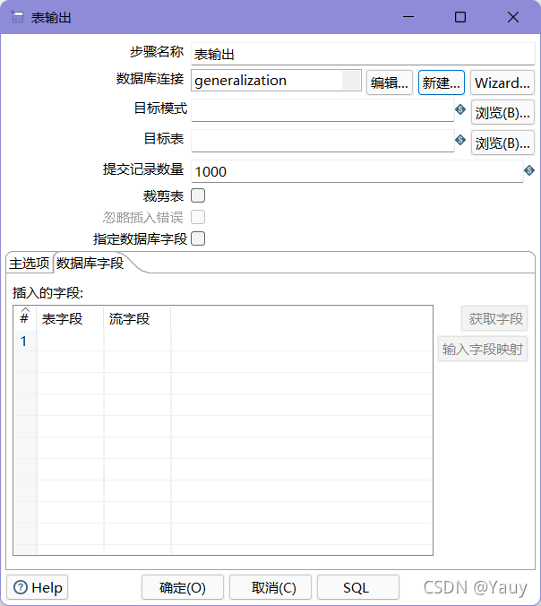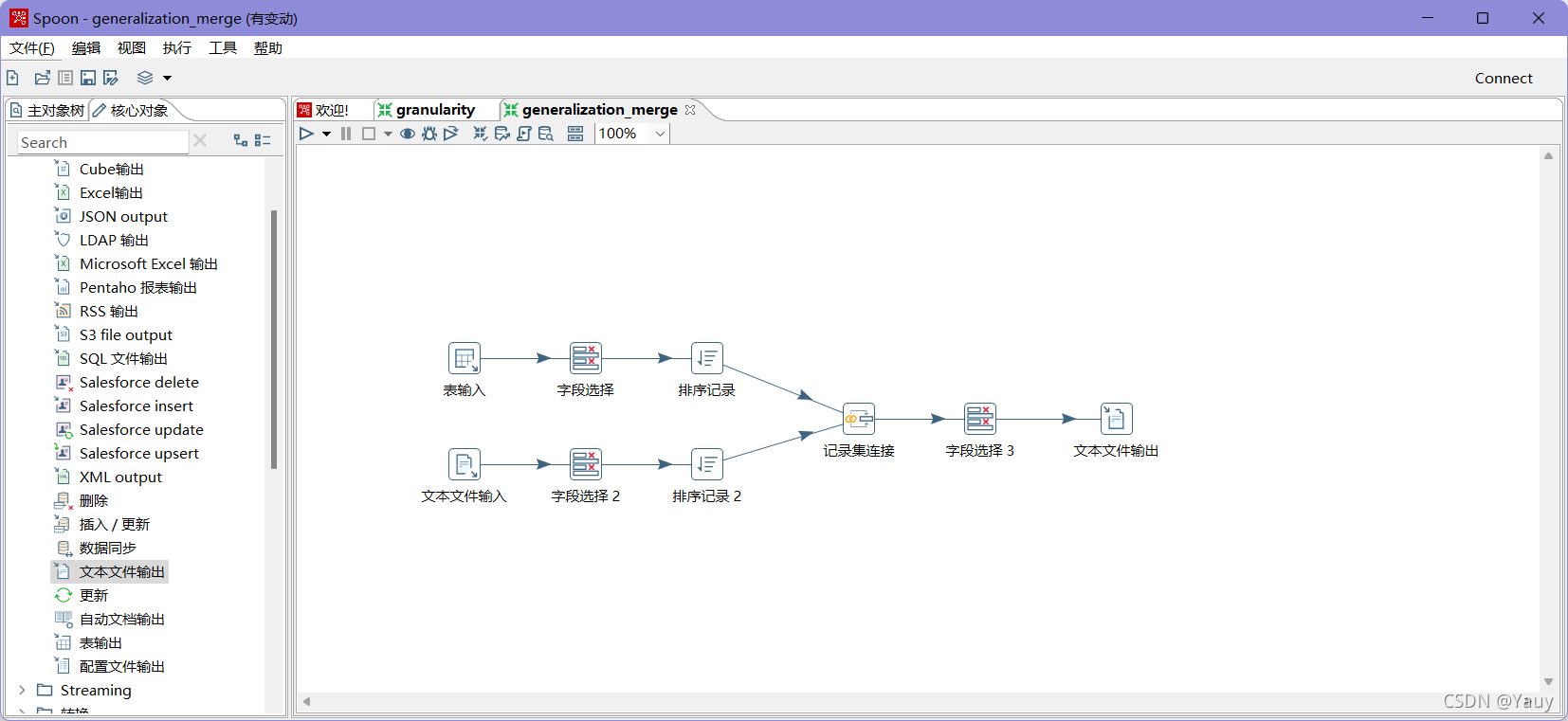 创建一个转换generalization_merge,并添加“表输入”、“字段选择”、“排序记录”、“记录集连接”、“文本文件输出”控件