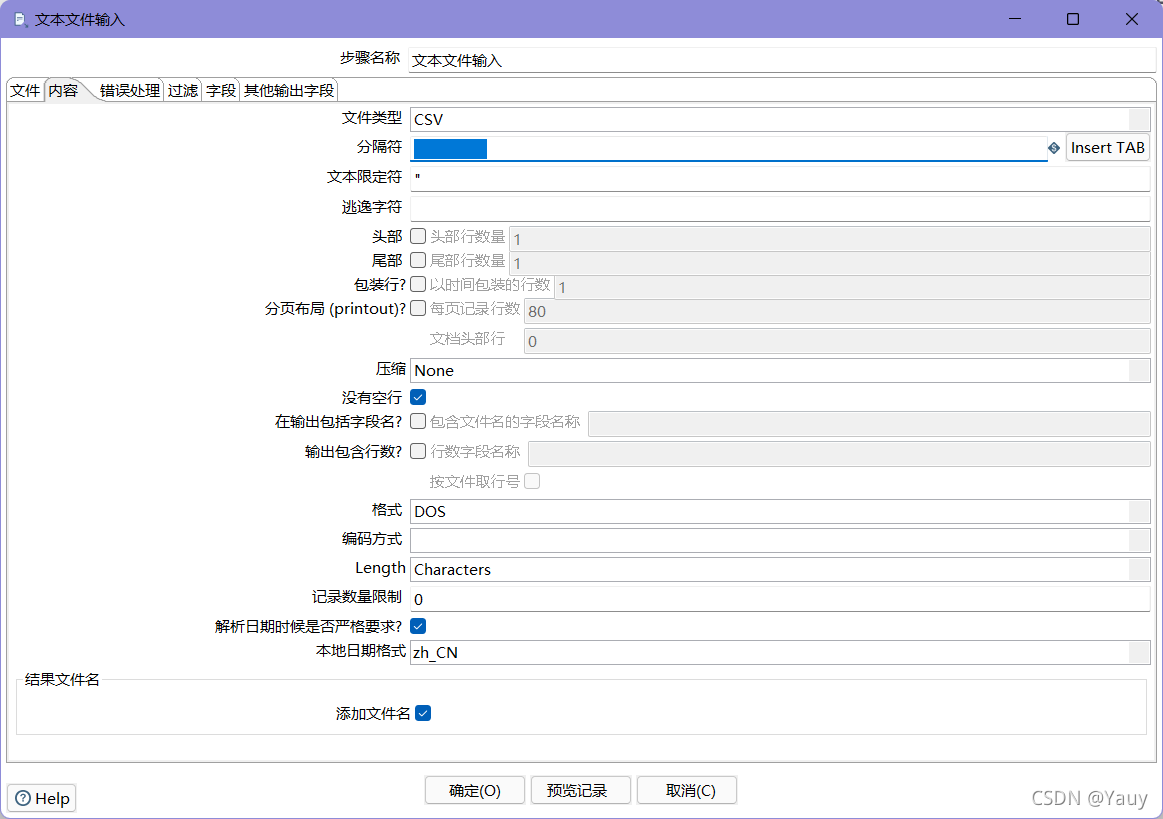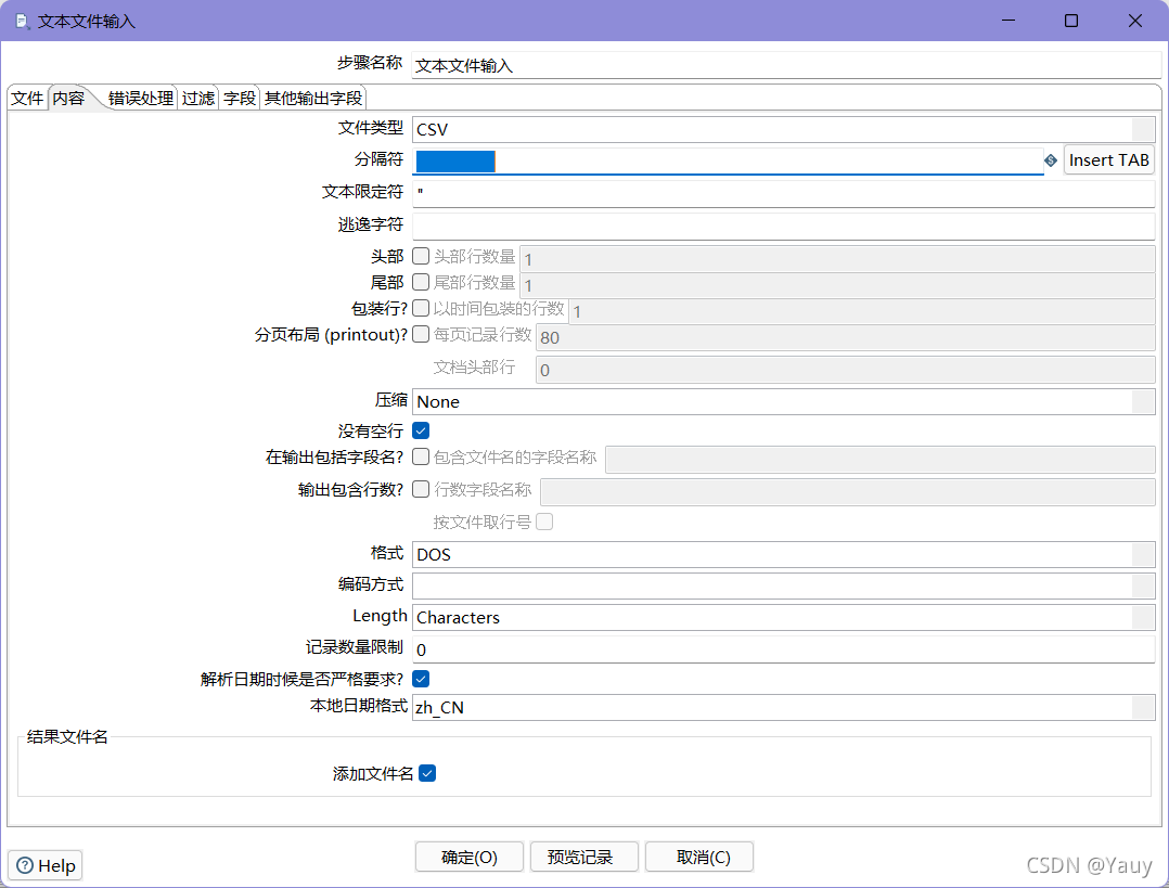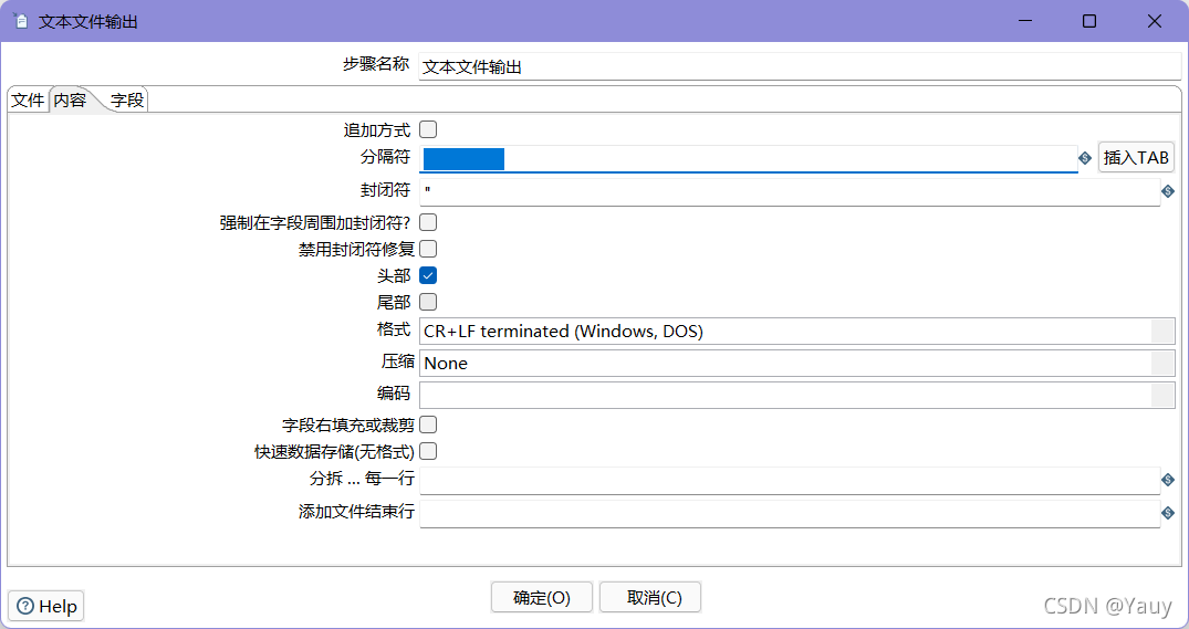 单击“内容”选项卡,在分隔符处清除默认分隔符“;”,单击【Insert TAB】按钮,在分隔符处插入一个制表符;取消勾选“头部”复选框