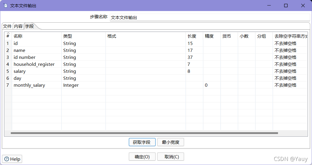 双击“文本文件输出”控件,进入“文本文件输出”界面,单击“文件名称”右侧的【浏览】按钮,选择输出文件,即文本文件personnel_data_new,单击“内容”选项卡,进入“内容”界面,清除分隔符处的默认分隔符,单击【插入Tab】按钮,插入Tab分隔符。并在编码处的下拉框选择“UTF-8”编码,单击“字段”选项卡,进入“字段”界面,添加要输出的字段