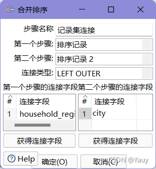 双击“记录集连接”控件,进入“合并排序”界面,在“第一个步骤”处的下拉框中选择“排序记录”,“第二个步骤”处的下拉框中选择“排序记录2”;在“第一个步骤的连接字段”和“第二个步骤的连接字段”处添加连接字段,这里添加的连接字段是household_register和city;在“连接类型”处的下拉框选择连接类型,这里选择的LEFT OUTER,即左外连接