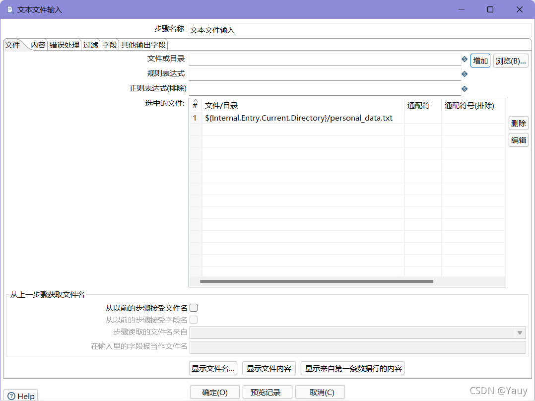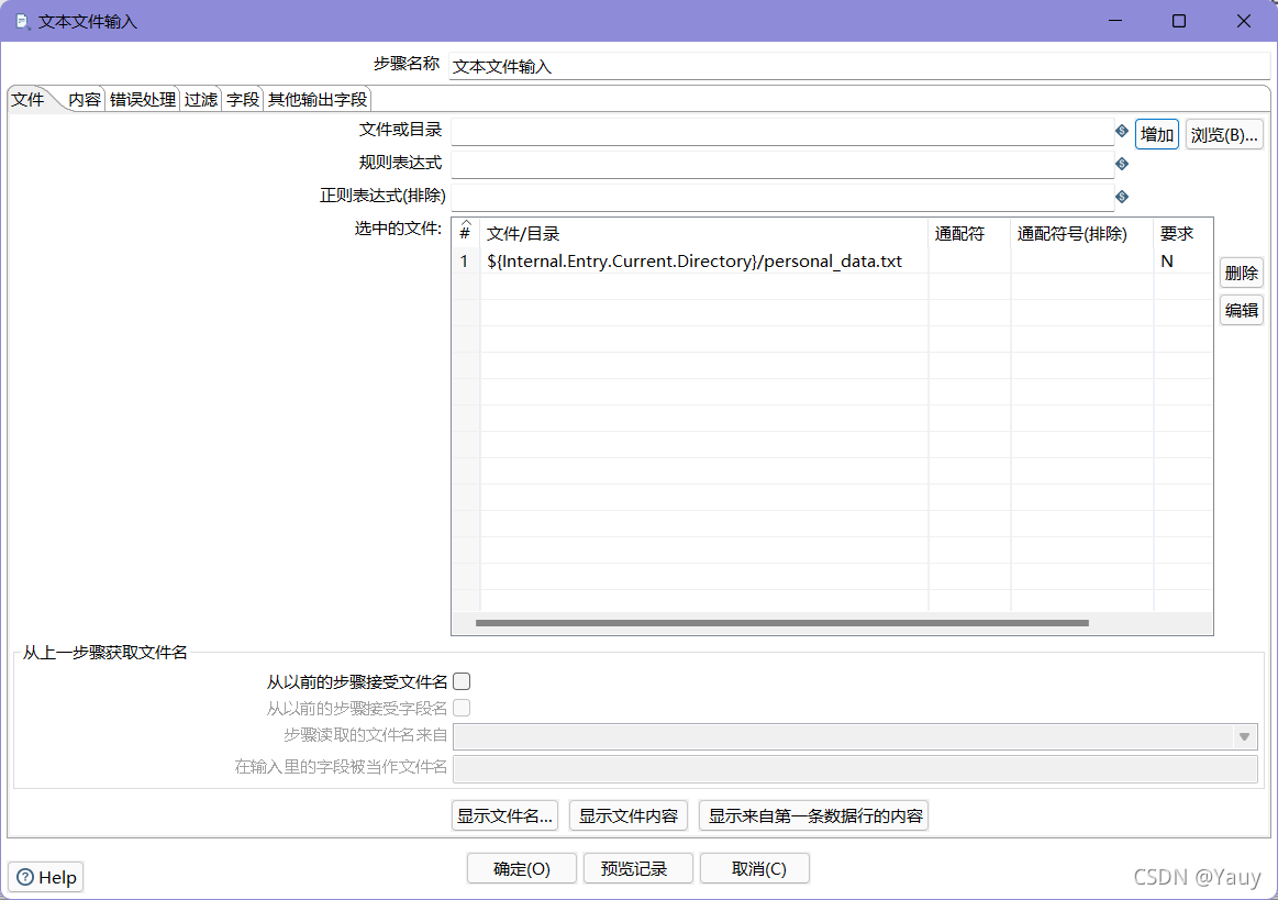进入“文本文件输入”界面,将要抽取的personnel_data.txt文件添加到generalization转换中