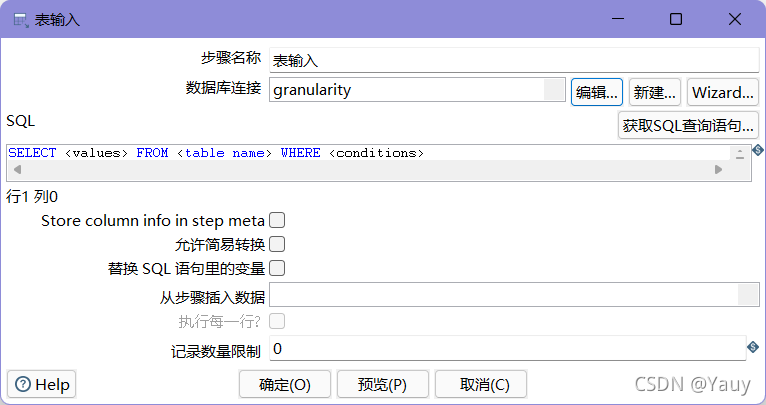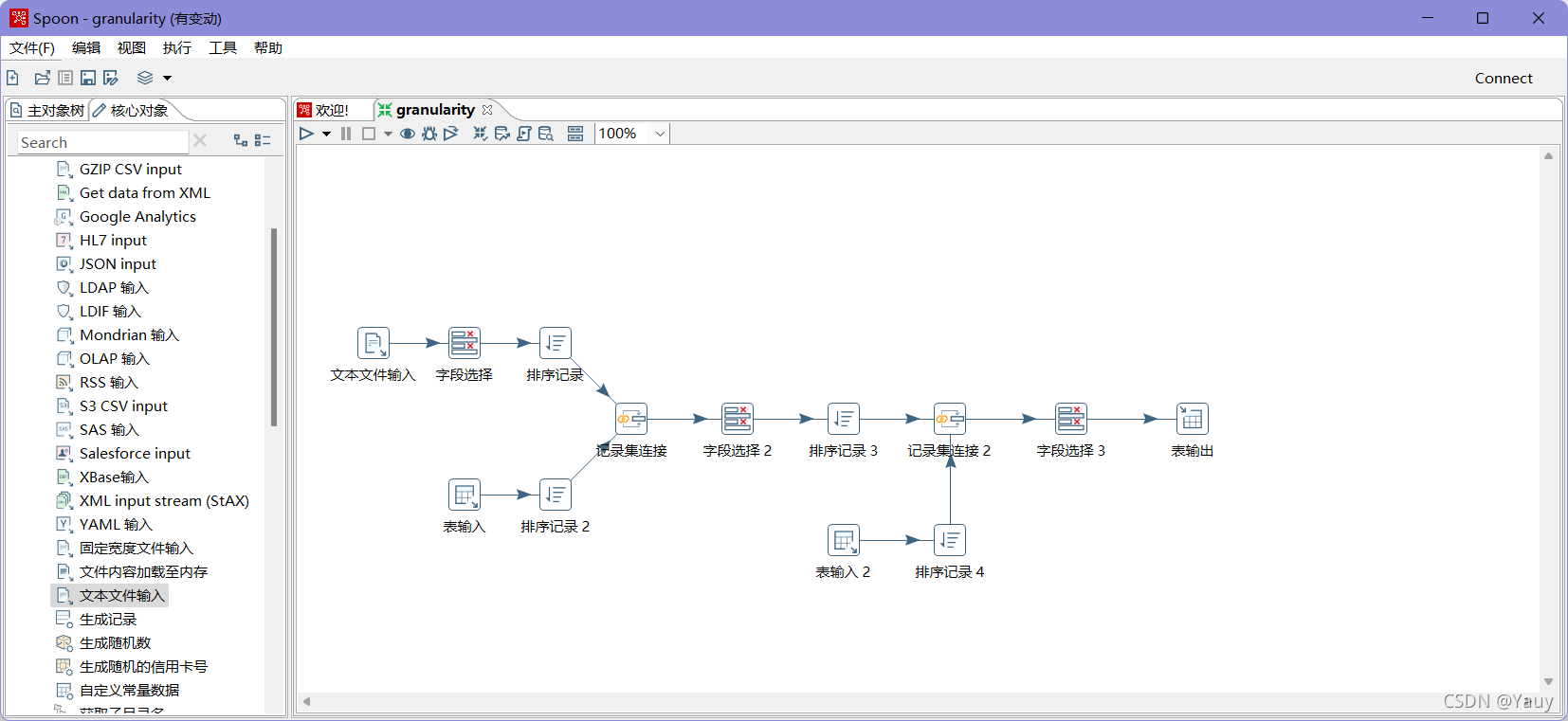创建转换granularity,添加“表输入”、“字段选择”、“排序记录”、“记录集连接”、“过滤记录”、“空操作”、“表输出”控件及hop跳连接线