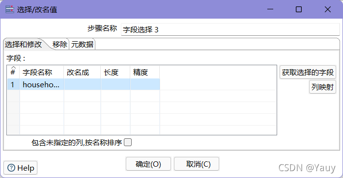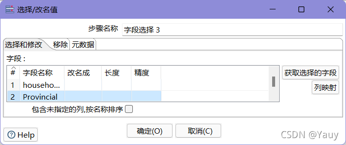 双击“字段选择3”控件,进入“选择/改名值”界面,在“选择和修改”选项卡处添加字段名称,这里添加的是记录集连接2流中的字段household_register和Provincial