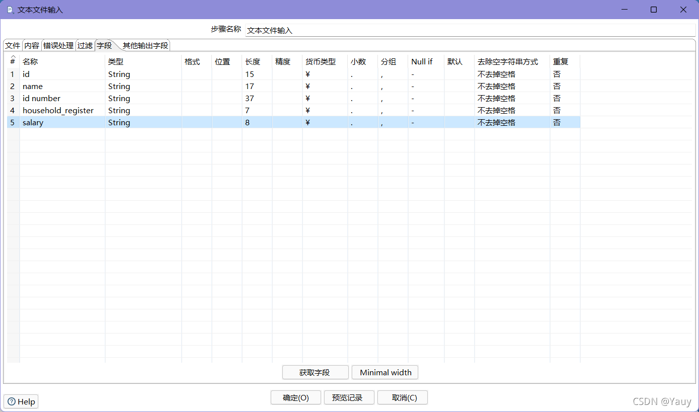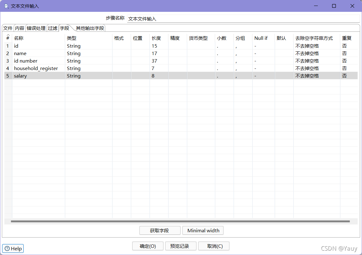 进入“字段”选项卡,根据personnel_data.txt文件的内容添加对应的字段名称,并指定数据类型