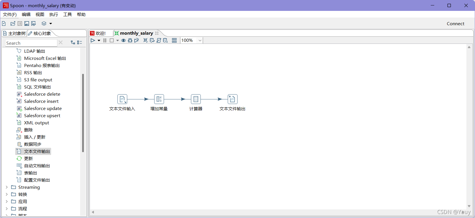 使用Kettle工具,创建一个转换monthly_salary,并添加“文本文件输入”、“增加常量”、“计算器”、“文本文件输出”控件