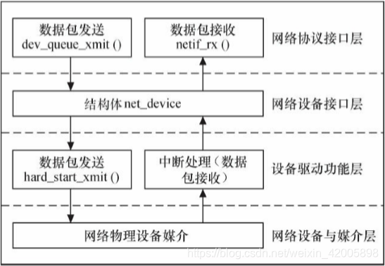 3)设备驱动功能层的各函数是网络设备接楼层net_device数据结构体的具体成员,是驱动网络设备硬件完成相应动作的程序,它通过hard_start_xmit()函数启动发送操作,并通过网络设备上的中断触发接收操作。