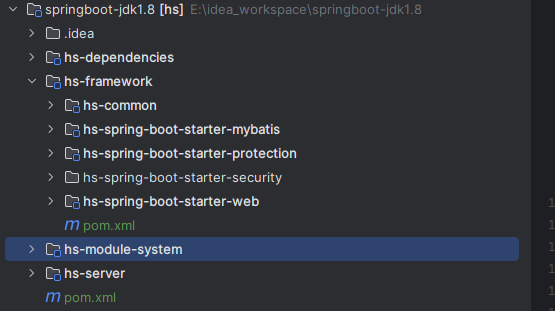 注意注意注意:由于项目是分模块部署,我们将启动类放置在hs-server,那正常项目启动类是扫描不到hs-spring-boot-starter-mybatis模块中的配置的,所以我们需要加一些配置,使自定义的配置类生效,可参考这篇文章:解决springboot分模块部署项目时,SpringApplication启动类扫描不到其他模块配置类的问题