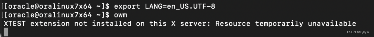 使用mac终端(终端会调用XQuartz,生成图形界面)连接oracle linux服务器,二者LANG都是zh_CN.UTF-8。owm图形界面显示乱码。关闭owm图形界面,直接在终端中输入命令设置LANG,export LANG=en_US.UTF-8,再次输入owm显示图形界面则正常。