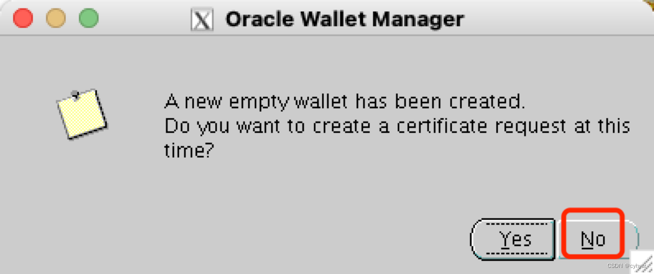输入密码后,点击【OK】,提示是否现在就希望创建一个证书请求。选择【No】