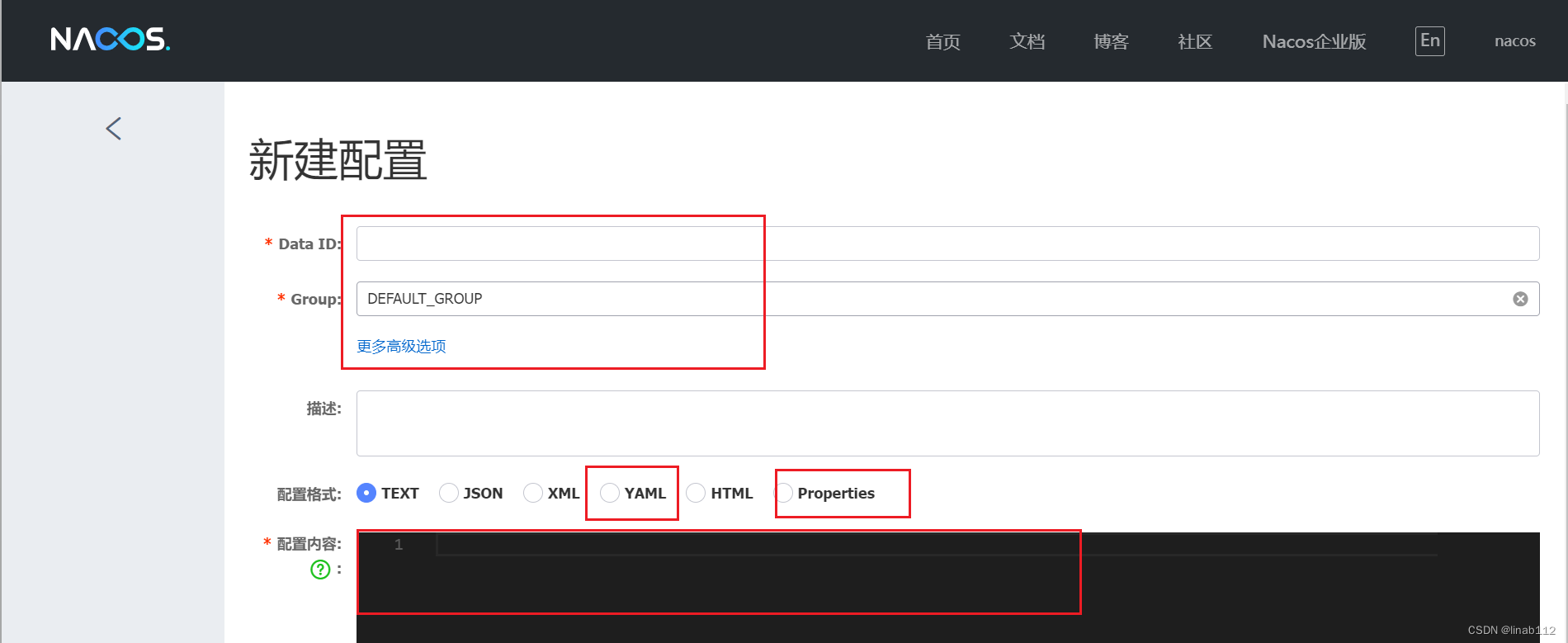 输入配置文件的data id,data id就是配置文件的名字,在springboot项目中根据data id引入此配置文件。