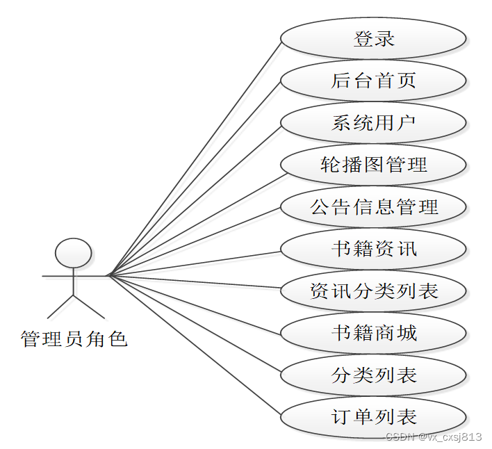 web后台管理上的管理员是维护整个网上书城小程序中所有数据信息的,管理员可以进行登录、轮播图管理、公告信息管理、管理员、会员用户、资源管理(书籍资讯、资讯分类列表)、商城管理(书籍商城、分类列表、订单列表)。管理员角色用例如图2-2所示。