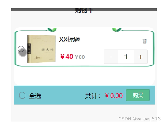 用户可以在“ 购物车”界面查看加购的书籍详情,可进行支付、删除等操作, 购物车界面如下图4-8所示。