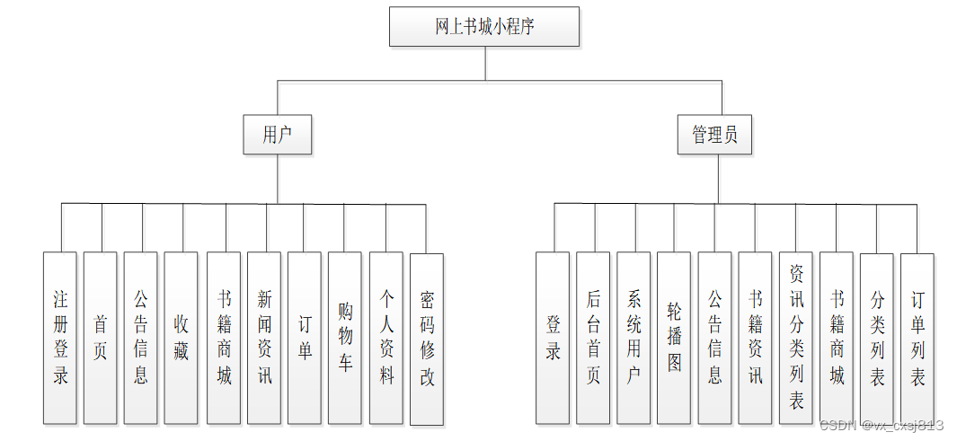 网上书城小程序我划分为了用户管理模块和管理员模块这两大部分。