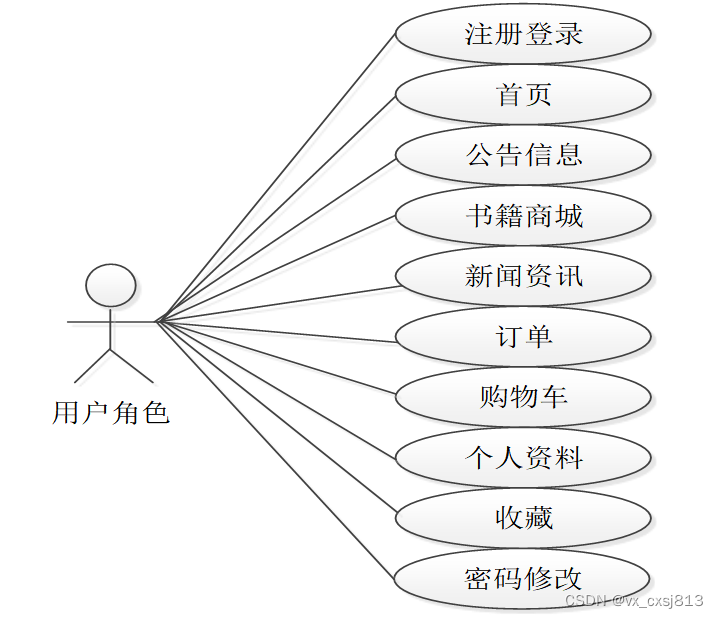 网上书城小程序的完整UML用例图分别是图2-1和图2-2。在参与者上包括用户以及管理员。前台上用户角色用例包括用户是注册成为我们正是会员用户、用户登录、公告信息、书籍商城、新闻资讯、订单、购物车、基本信息(个人资料、密码修改、收藏),用户角色用例如图2-1所示。