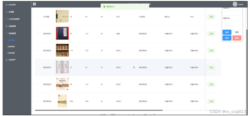 网上书城小程序中的管理人员可以对书籍信息进行添加、删除等操作管理的。书籍商城管理界面如下图4-13所示。
