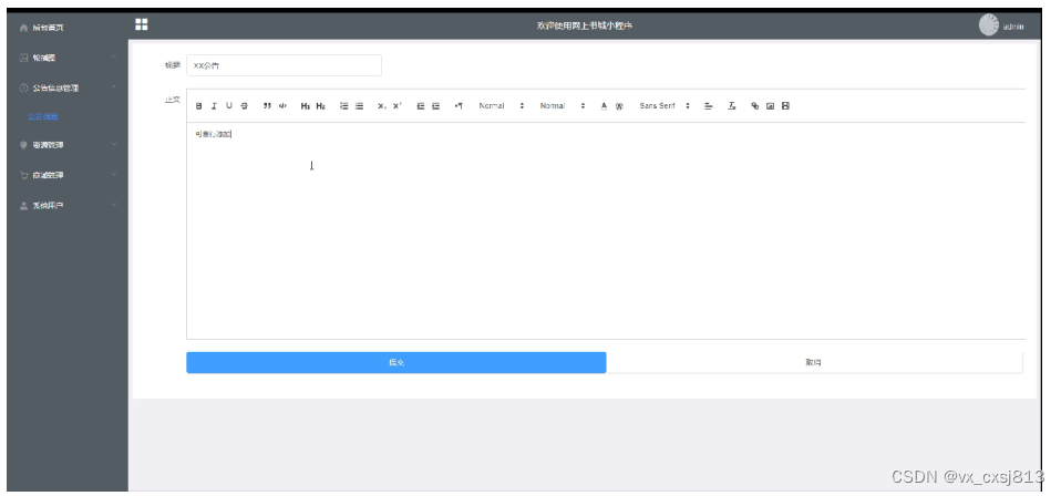 网上书城小程序中的管理人员是可以发布公告信息,公告信息管理界面如下图4-10所示。