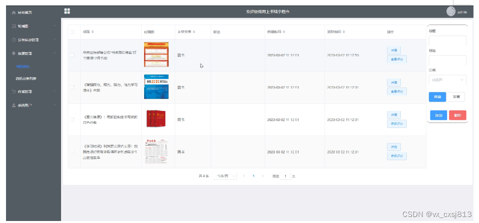 网上书城小程序中的管理人员是可以对网上书城小程序内的不同资讯的分类下的资讯信息进行维护和管理的,资源管理界面如下图4-11所示。