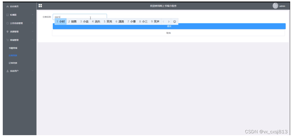 网上书城小程序中的管理人员是可以对网上书城小程序内的书籍信息进行分类等。分类列表管理界面如下图4-12所示。