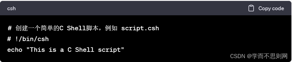 C Shell(csh)是一种Unix shell,它具有与Bash等其他shell不同的语法和特性。C Shell的语法和功能受到了C编程语言的影响,因此在某些方面与Bash等其他shell不同。:C Shell的语法与Bash等shell有一些不同之处。例如,命令的结束通常使用分号而不是换行符。:与其他shell一样,C Shell也支持脚本编写。命令来创建命令别名,以简化常用命令的输入。命令