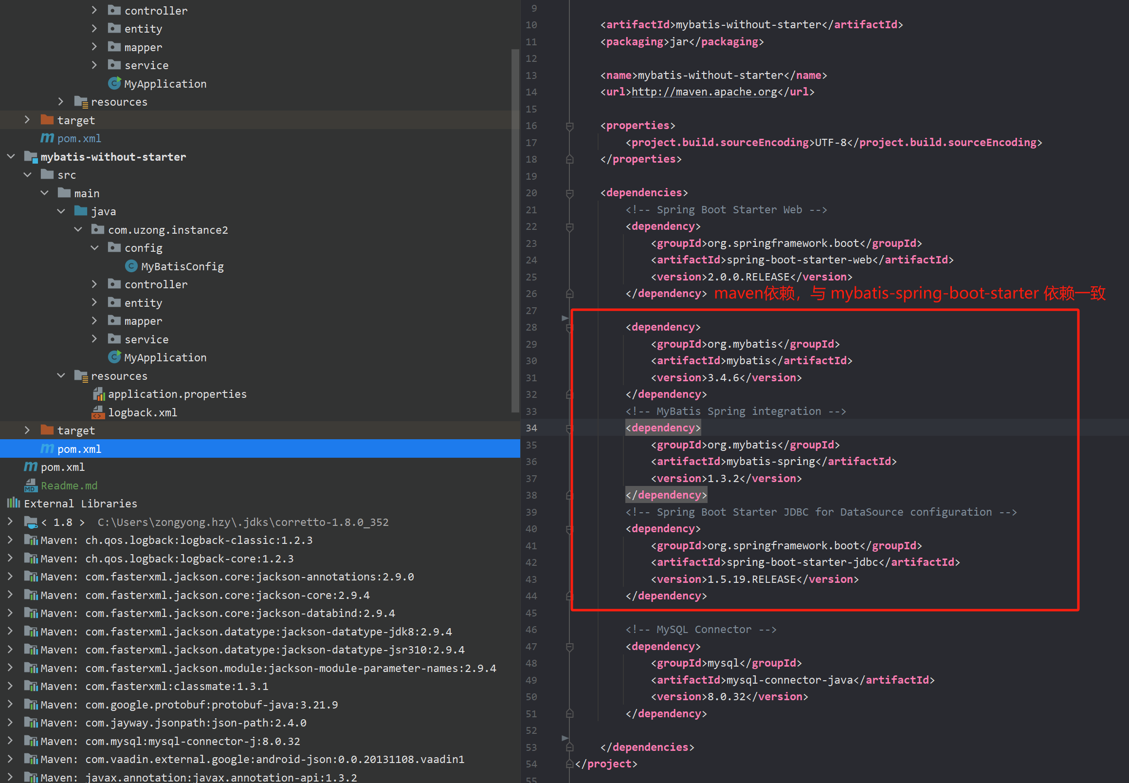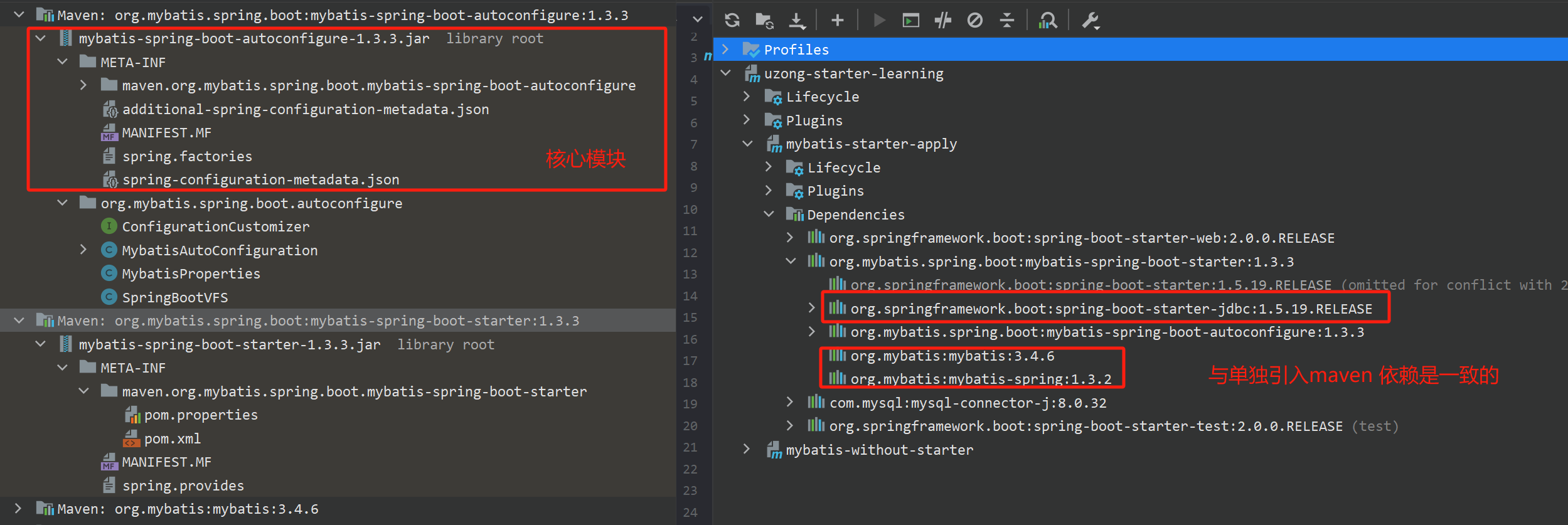 与 mybatis 单独引入不同, mybatis-spring-boot-starter 依赖包还有一个不一样的依赖 mybatis-spring-boot-autoconfigure