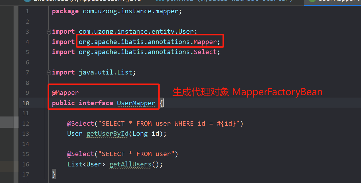 @Select("SELECT * FROM user WHERE id = #{id}")