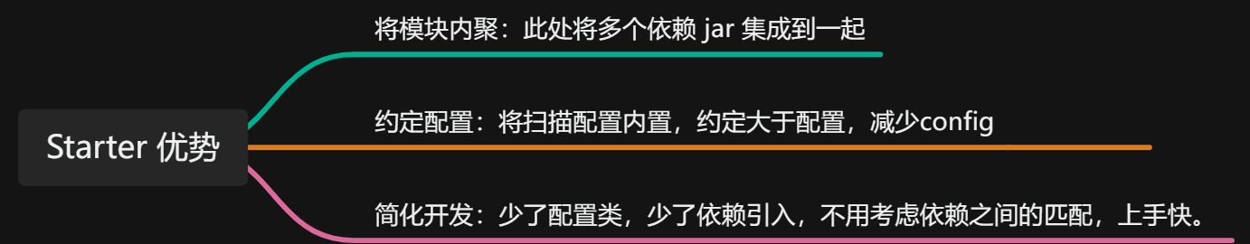 而 Starter 的作用,像一个皮条客,提供了一个场子,把各个核心功能通过合理的手段整合到一起,包装成对外提供价值的服务。
