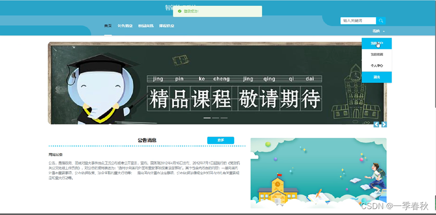 进入系统可以查看:前台首页,公告消息,校园喜讯,课程信息,我的(我的账户、我的收藏)后台首页,模块管理(选课信息、学生信息、课程测试、提交测试、成绩查询、课表信息),个人管理。等功能,还可进行相应的操作,如图所示。