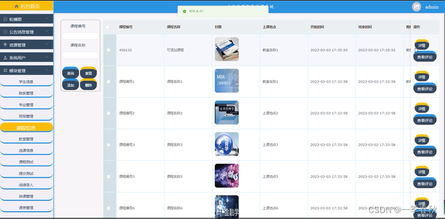 课程信息:可以通过搜索课程名称、课程名称进行查看课程编号、课程名称、封面、上课地点、教师编号、姓名等详细信息。并可以进行查询、重置、删除、添加等操作,如图所示。