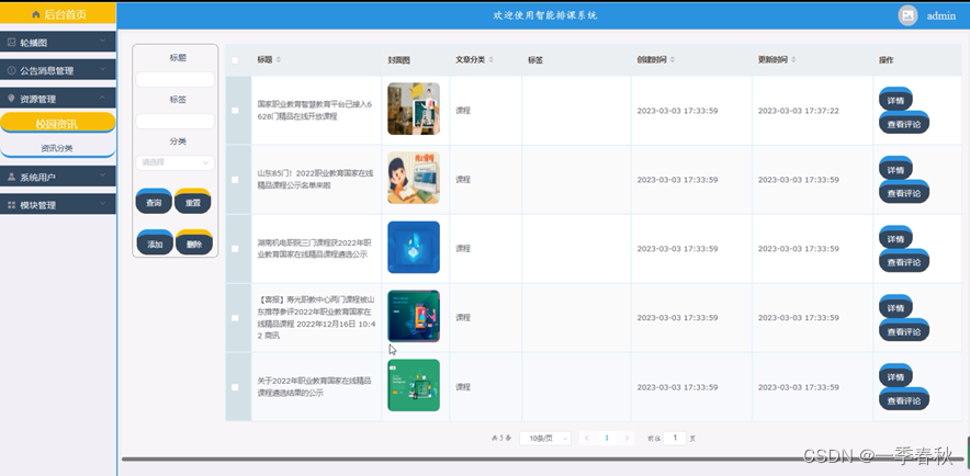 校园资讯:可以通过搜索标签、标题、分类进行查看校园资讯,可以进行查询、重置、删除、添加等操作,如图所示。